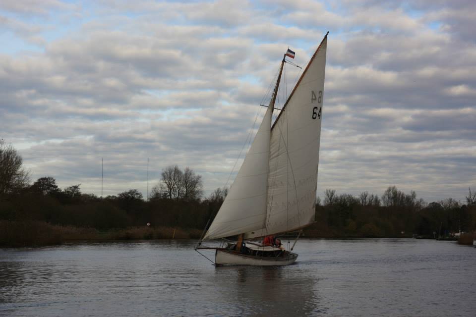 Having ‘forgotten’ my waterproofs, I retired into the cabin to sit things out. Once through Ludham Bridge, conditions had deteriorated into a bleak, gusty, viscious SE gale. Obviously we reefed, hoisted sail & ‘took off’… (!)