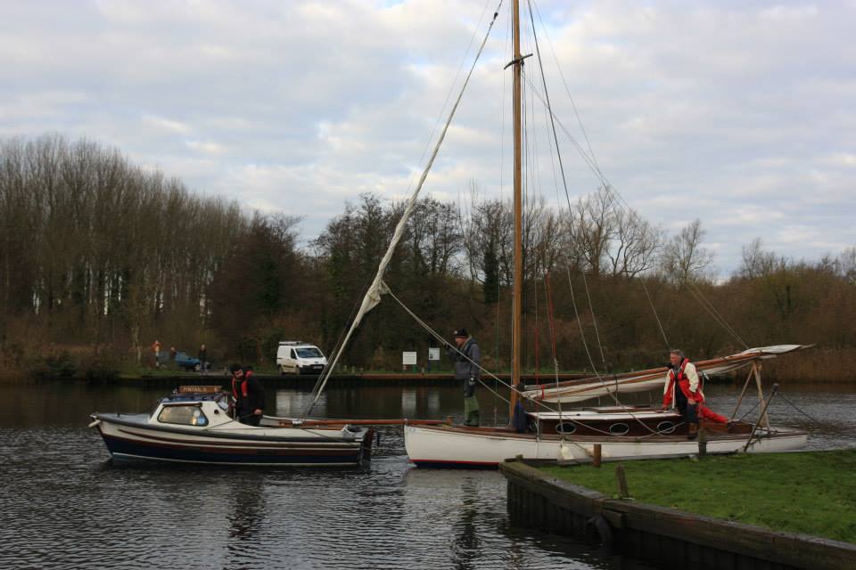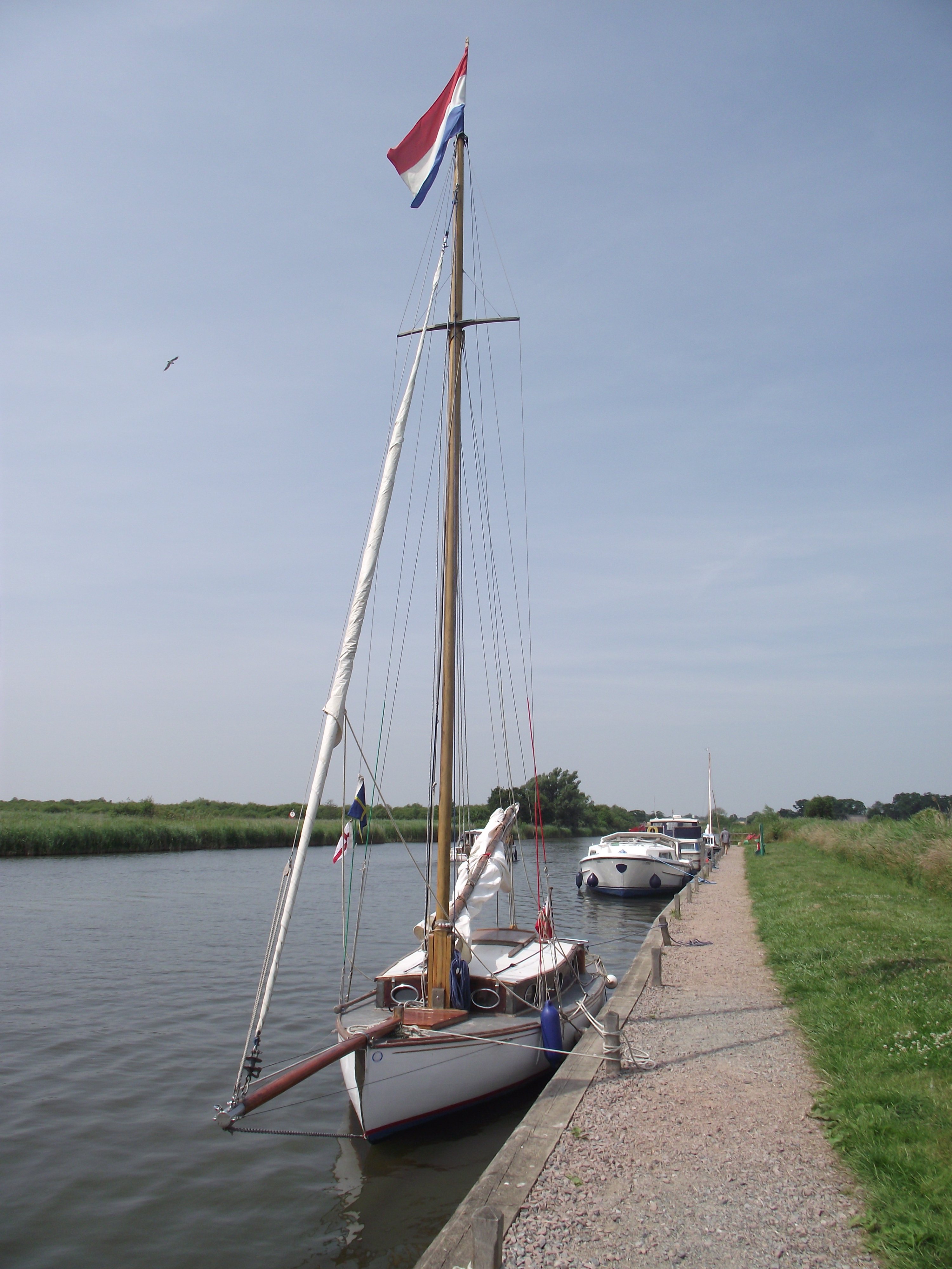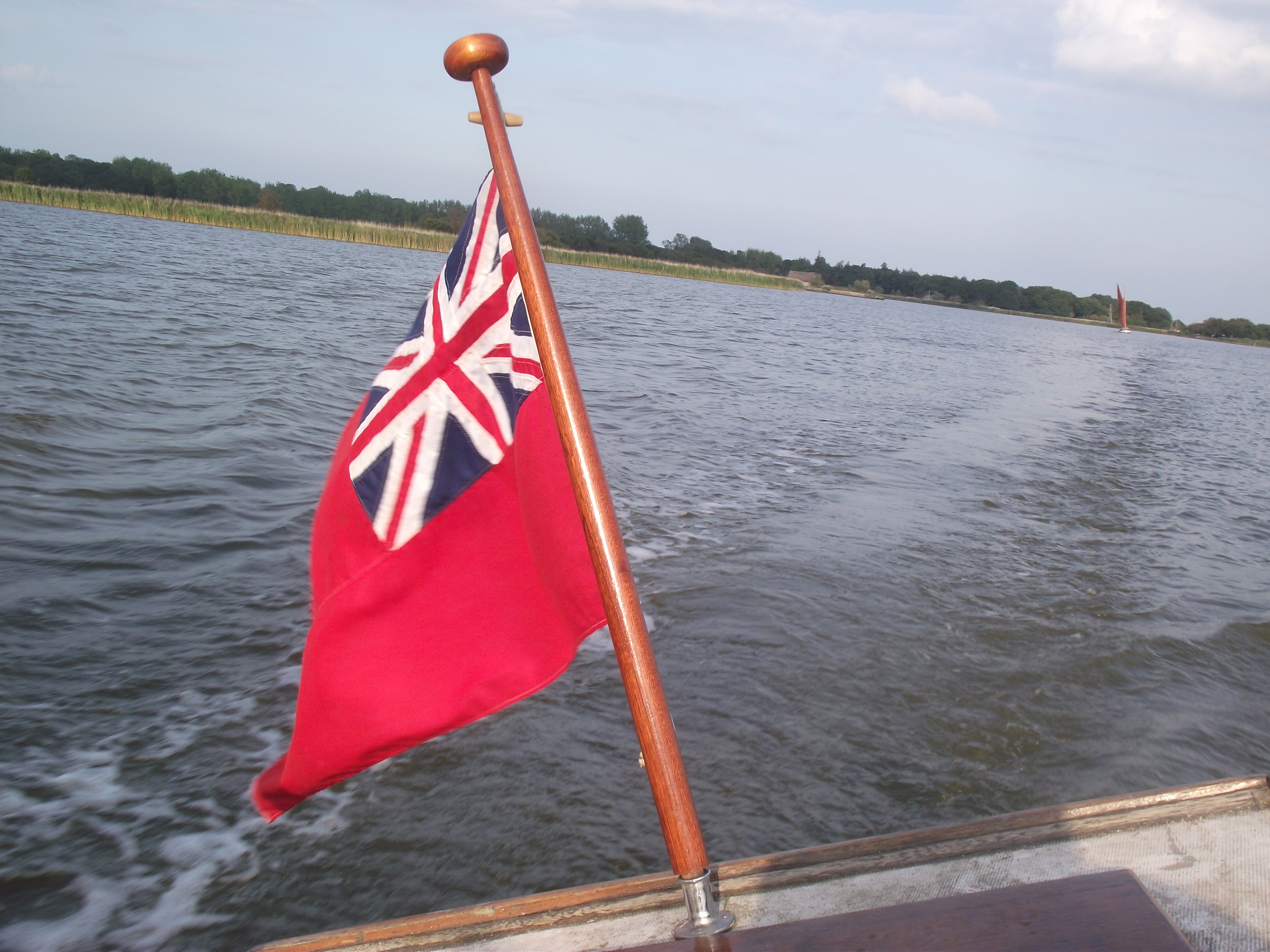 A brief quant later, both vessels were moving quite nicely onto the Thurne, with ‘F’ sporting her new, oversize Cornish ensign. Several infuriating windshifts later, we had tacked our way into Potter, and temporarily moored alongside a Richardson’s bathtub.