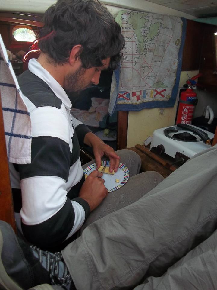 Such amusements aside, once again we slipped off on a broad reach with Bill helming, whilst I busily prepared lunch (beef/mustard sandwiches).