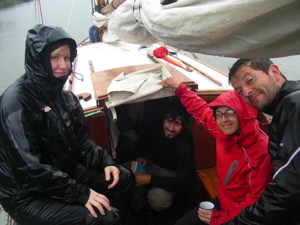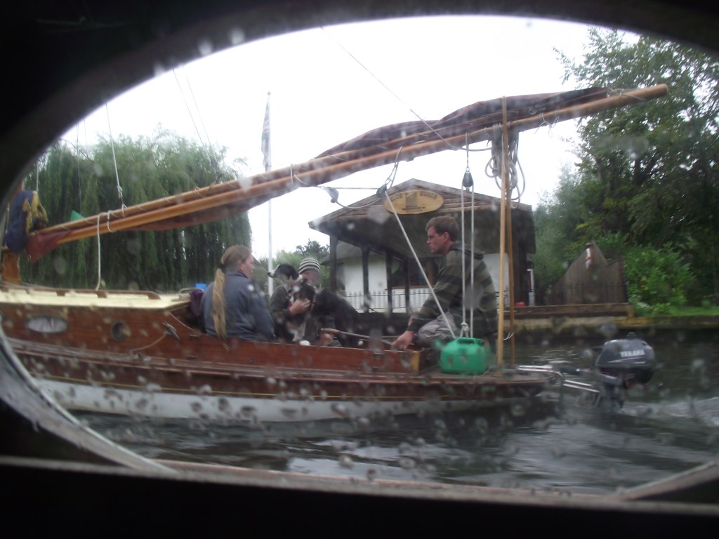 Rain. Lots of it. A brief, but dense shower woke us all & peppered us throughout breakfast. There was a fierce competition as to how many people could fit inside ‘Corsair’, under cover. Eventually we realised it was futile, broke camp & set off to Wroxham.