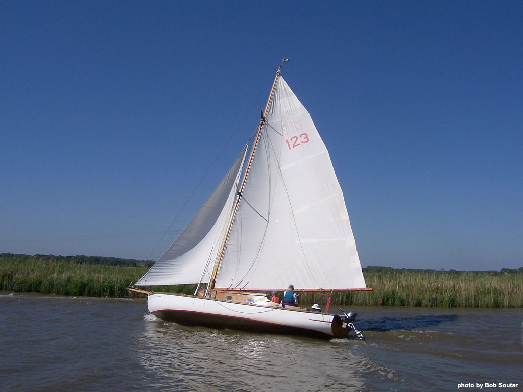 Her mainsail is from an international star one-design, giving her a powerful performance. Upwind in heavy-weather especially, she just takes off, and points, and points… A far cry from our own performance, sadly.
