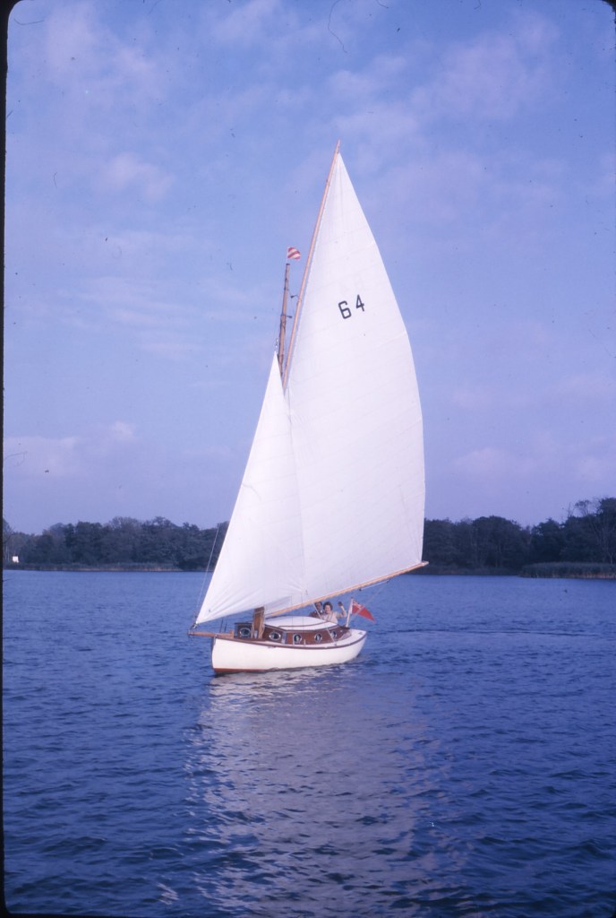 Her racing career with the Campbells was… chequered! In 1964, at Oulton week regatta they over-cooked it slightly, as Jamie recounted; “We moored at Leo Robinson’s yard for Oulton weeks, and I can remember seeing the mast ‘snowdropping’ – it was inevitable it was going to break for at least 100yards. Lowering the stump wasn’t easy against the lead counterweight!!”