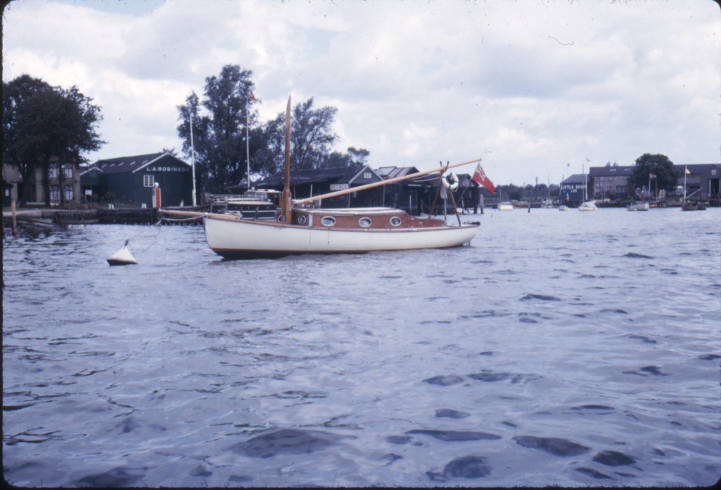 In 1956, C&H disposed of ‘Privateer’ to a Mr J. Brittain – who kept her for 7 years, where she passed to Paul Bown’s father. He’s kindly shared with me this photo of ‘Privateer’ at South Walsham Broad, 27th July 1963 – when they bought her;