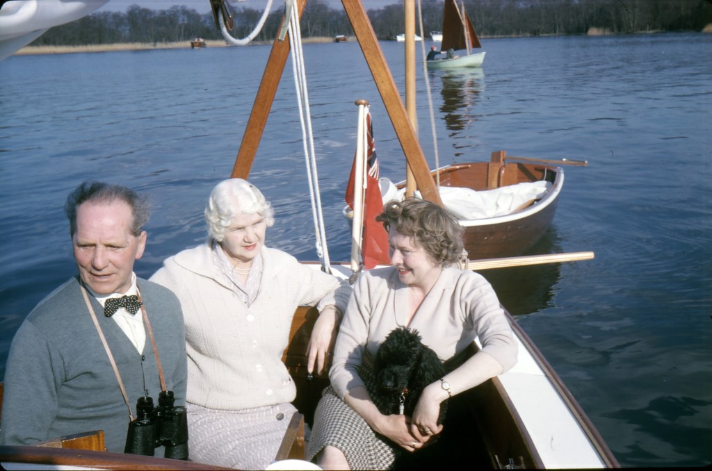 Once on Hickling – Jean was often set adrift in the pram dinghy, learning to row quite quickly. (!) Whilst her parents roared up & down the Broad;