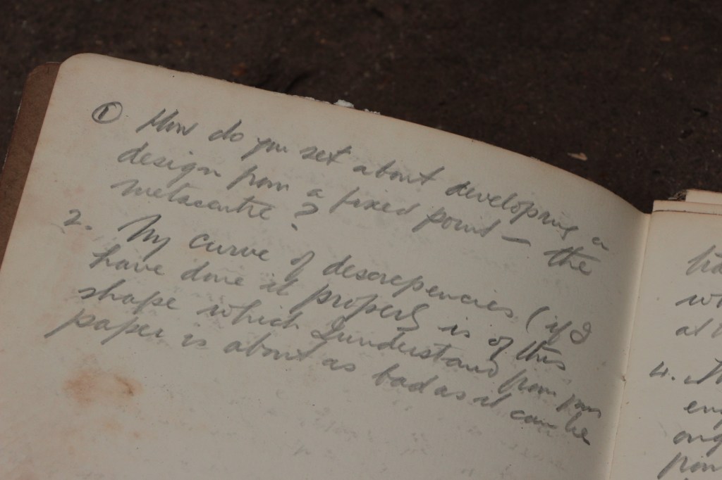I also found some lines drawings, and the most breath-taking of all. I found his design notebook! Including notes of his response to an R.I.N.A paper on metacentric hull theory, and some of his calculations for at least two designs. ‘Khala Nag’ and ‘Redwings’.