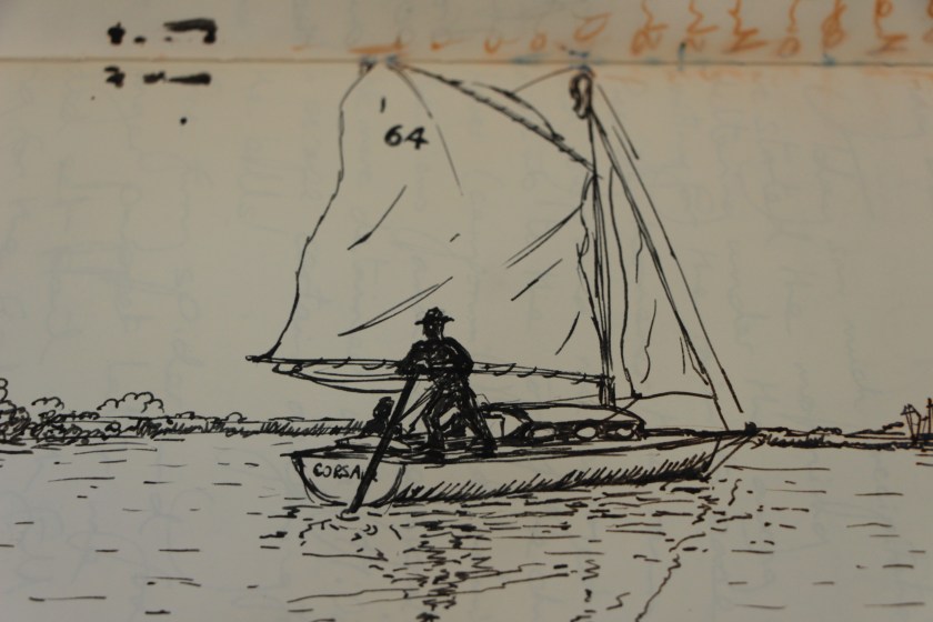 We then motored to Black Horse Broad, and positioned ourselves alongside MH, to steel ourselves for a quick blast around the broad itself. Sailing on Black Horse would be a first for me, little did I know it was where ‘Corsair’ had her first sail under new ownership, back in 1961.