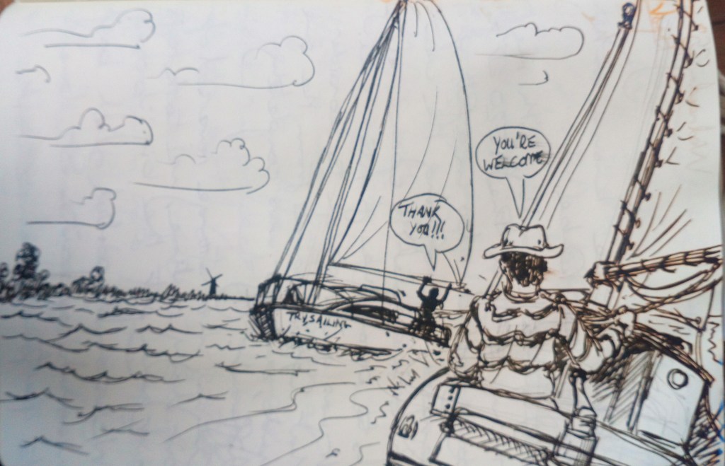 So. Waking up & discussing our criminality, we decided the best option was to reef down & take a ‘brisk’ SW tack out of the Thurne.