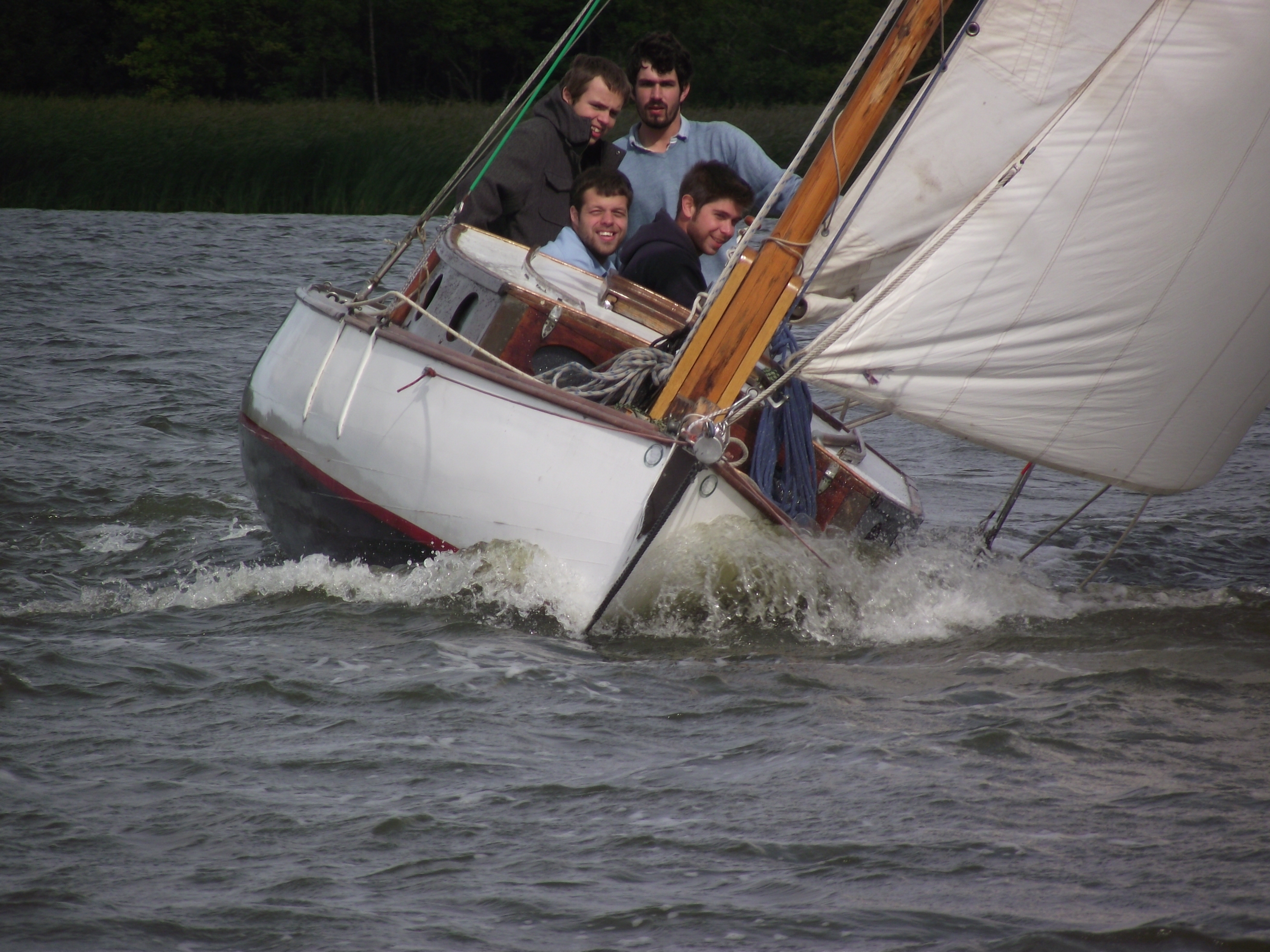 Having ‘forgotten’ my waterproofs, I retired into the cabin to sit things out. Once through Ludham Bridge, conditions had deteriorated into a bleak, gusty, viscious SE gale. Obviously we reefed, hoisted sail & ‘took off’… (!)