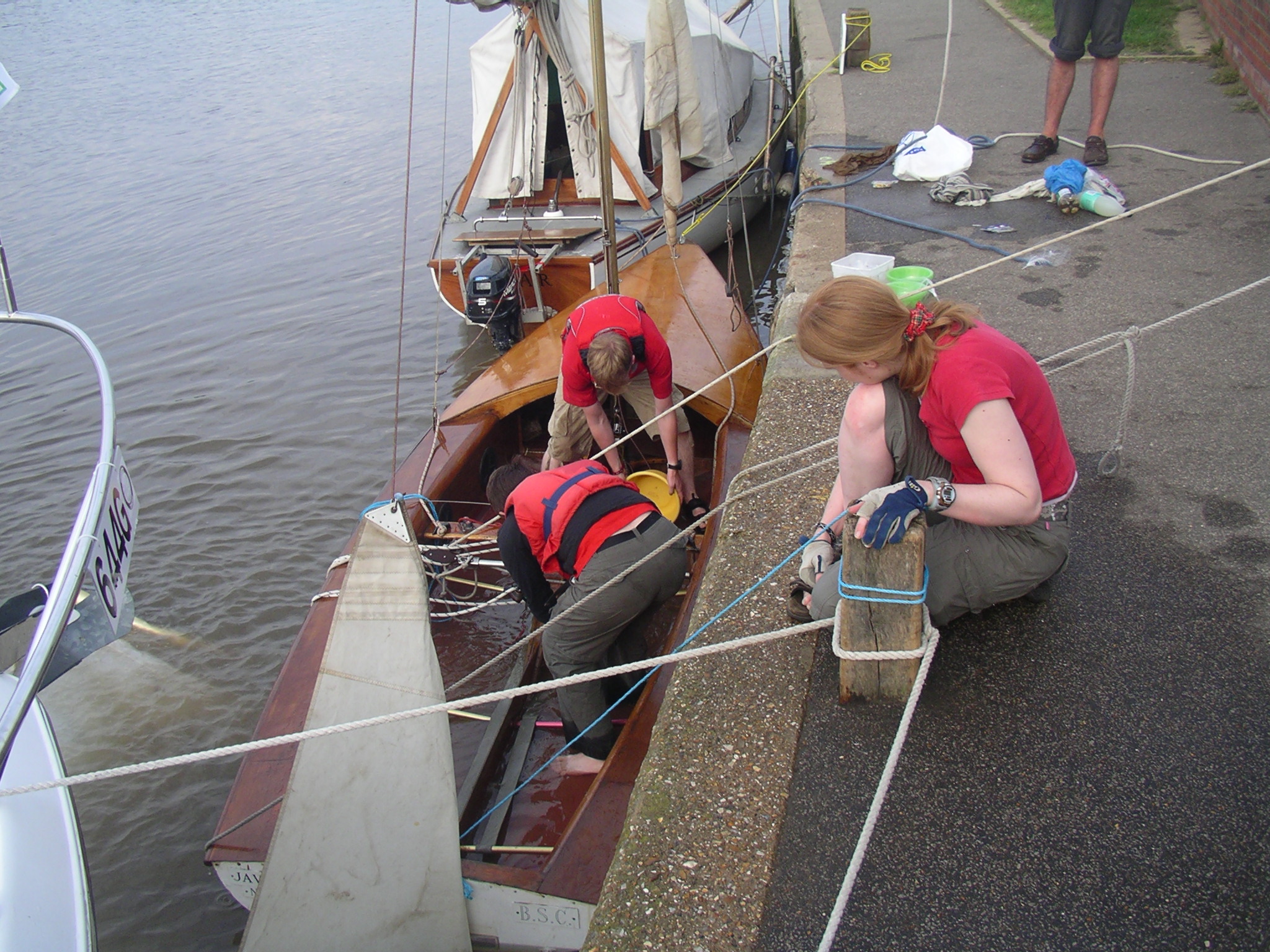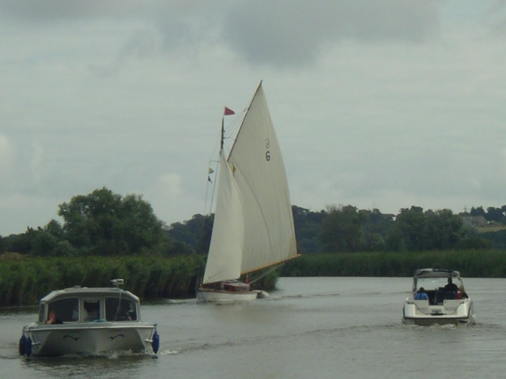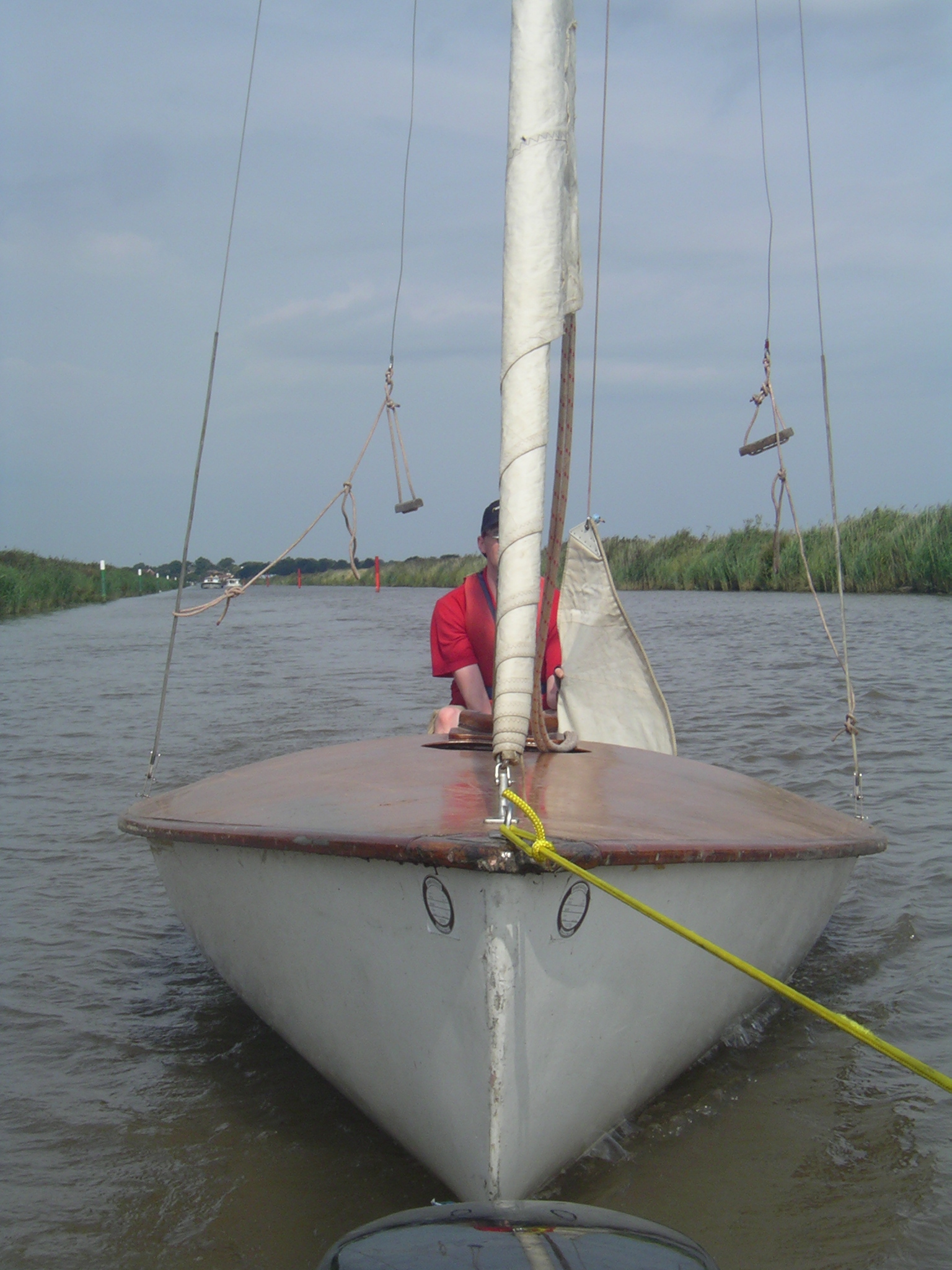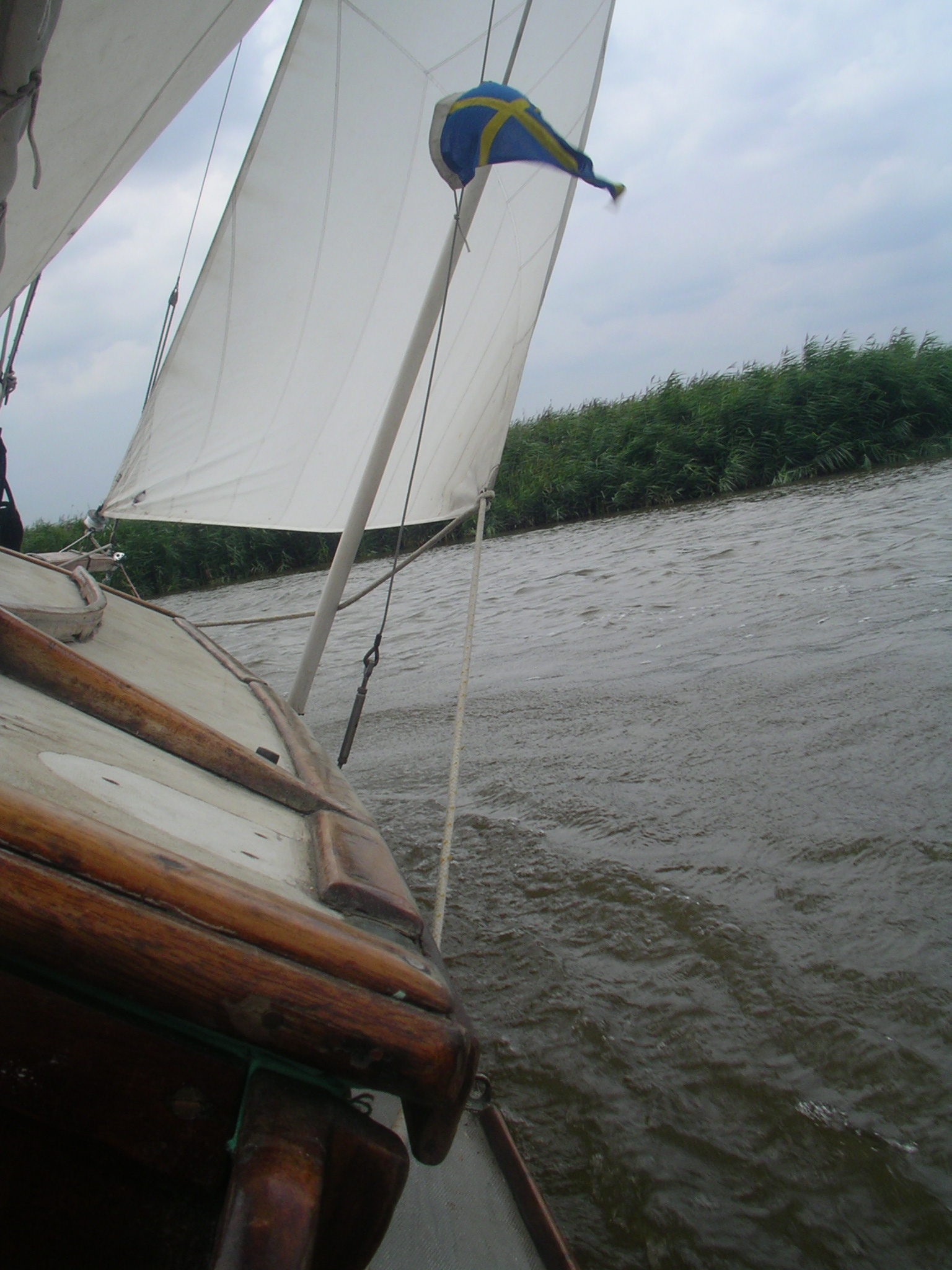 Eventually, ‘Corsair’ reached Surlingham Ferry – we had to find the edge of the moorings using the quant as a depth sounder (falling in would have been a bad idea!) – and again, we tied up on underwater mooring posts, stuck our quant in to stop her over-riding the bank, and waded to the pub.