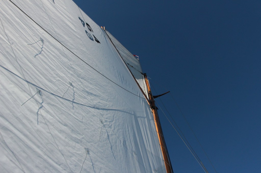 Her mainsail is from an international star one-design, giving her a powerful performance. Upwind in heavy-weather especially, she just takes off, and points, and points… A far cry from our own performance, sadly.